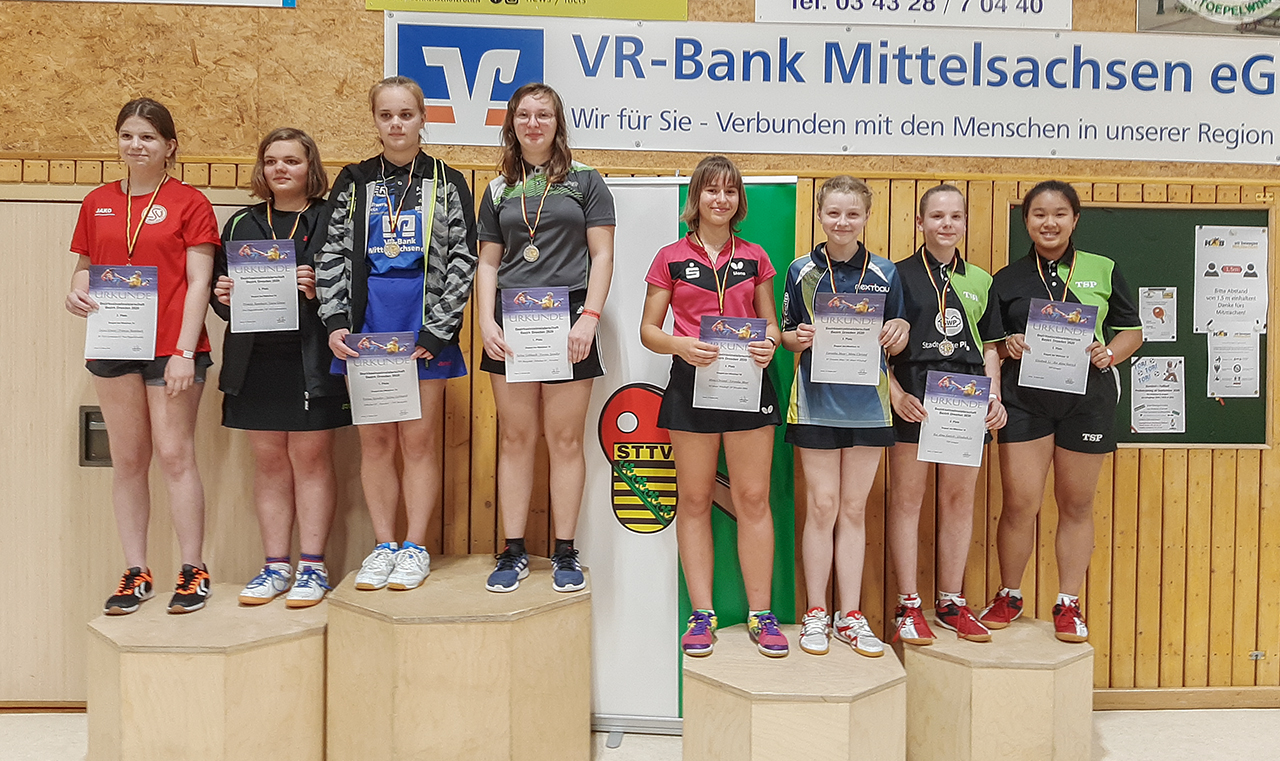 Alma, Flora und Elisabeth hießen unsere Starterinnen bei den großen Mädels in der U18. Großes Lob an Elisabeth, die sich nach der schweren U15-Konkurrenz gestern heute noch einmal dieser deutlich anstrengenderen Aufgabe stellte und schon sehr viel mutiger agierte. Auch wenn letztendlich keine Endrundenplatz heraussprang, kann sie stolz auf diese Leistung sein. Alma verpasste im ersten Spiel ihrer Vorrunde den Start etwas oder vielleicht war sie noch müde vom Samstag – auf jeden Fall war dieses erste, verlorene Spiel entscheidend dafür, dass sie im Einzel in der Vorrunde „hängen“ blieb. Maja und Flora hingegen schafften es in die Endrunde und standen am Ende bei der Siegerehrung gemeinsam auf dem Treppchen des 3.Platzes. Auch hier gelang den beiden das Kunststück, dieser Medaille noch eine Zweite hinzuzufügen, denn auch im Doppel sicherte sich Flora mit Alma Bronze, während Maja mit ihrer Partnerin Amelie Mocker aus Redeburg sogar noch im Finale stand und sich dort die Silbermedaille erkämpfte.