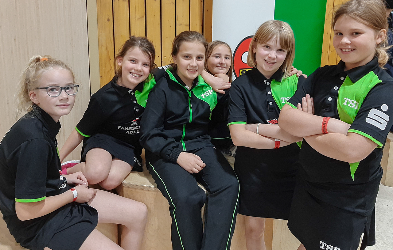 Gleich 12 Kinder aus unserem Verein schlugen dann heute bei den jüngsten und den ältesten Jugendklassen auf: Die kleinen Mädels (das „Weibervolk“) spielten zum ersten Mal alle zusammen in so einem großen Turnier und machten ihre Sache sehr gut. Vier von ihnen (Neela, Hermine, Aileen und Leann) schafften es immerhin aus der Vorrunde heraus und Neela konnte sich bis ins Halbfinale spielen, aus dem sie freudestrahlend eine Bronzemedaille mitnahm. Das sollte aber nicht ihre einzige Medaille heute bleiben: Gemeinsam mit Hermine und neben dem zweiten TSV-Doppel Leann/Aileen schnappten sie sich auch noch in der Doppelkonkurrenz die Bronzemedaille.