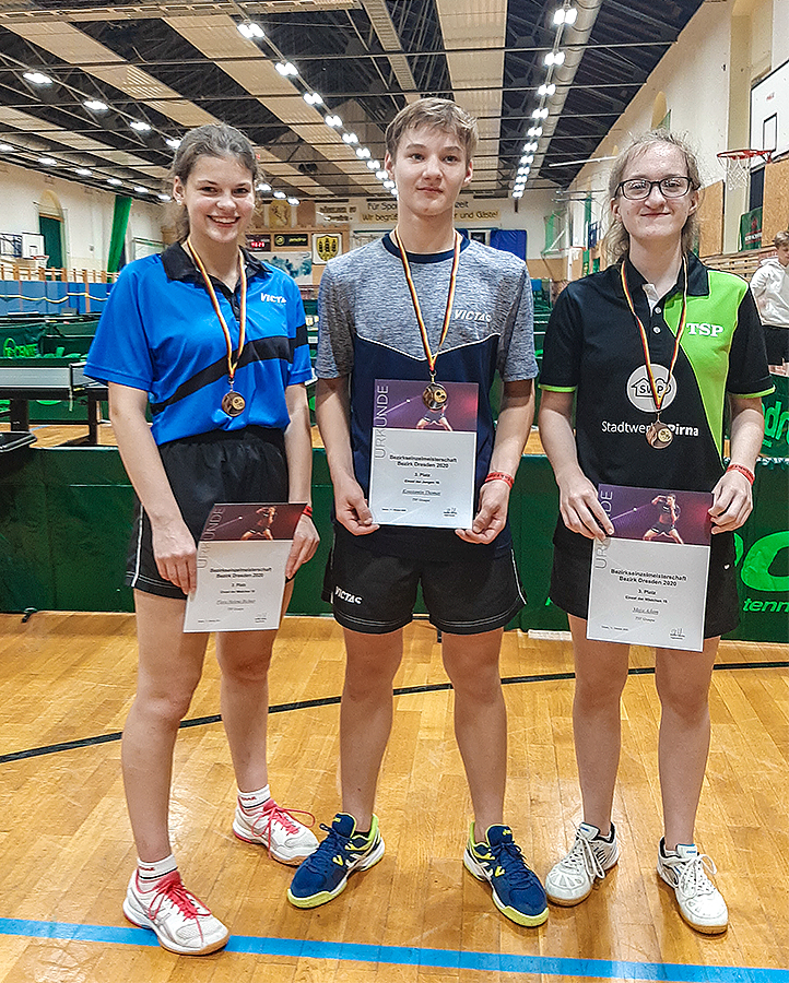 Konstantin war als Gruppensieger in die Endrunde gestartet und agierte in den ersten beiden Sätzen gegen den bärenstark spielenden Olli Roßmann aus Radebeul teilweise etwas zerfahren und auch überheblich. Nach einer kurzen, aber deutlichen Ansage vom Coach wendete er ab dem 3. Satz das Blatt, spielte sehr fokussiert und taktisch klug. Mit 3:2 zog er in das Halbfinale ein und hatte damit seinen Startplatz bei der LEM gesichert. Im Spiel selbst hatte er trotz tapferer Gegenwehr keine Chance gegen sehr aggressiv und spinorientiert spielenden Radebeuler Max Tronick. Bei der Siegerehrung freute sich Konsti schon wieder sichtlich über seine zweite Bronzemedaille.