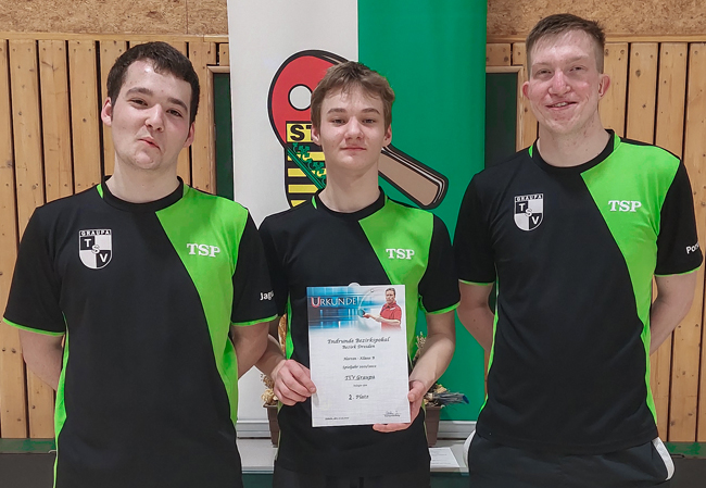 Deutlich schwerere Aufgaben hatten die jungen Männer des TSV zu lösen, denn mit dem TTC 49 Freital, dem TSV Leubnitz und dem SC Riesa warteten starke Gegner in dieser Bezirks-Endrunde. Peter, Joshua und Konsti hatten sich viel vorgenommen für dieses Turnier, mussten aber in den ersten drei Einzeln des Startspieles gegen dien TTC Freital erst einmal mit den erfahrenen Gegnern und deren starker Spielweise klarkommen. Trotz aller tapferen Gegenwehr verschafften sich die Randdresdner einen 3:0-Vorsprung, der letztendlich spielentscheidend war. Auch wenn das Doppel Peter/Joshua relativ sicher und Konsti in einem sehenswerten Spiel gegen Martin Guhr die Anschlusspunkte holten, machte schlussendlich Daniel Tillig, die Freitaler Nr. 1, den Siegpunkt für den TTC.